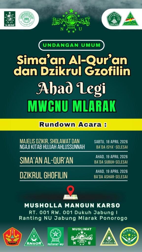 Mlarak, Ponorogo – Pada Ahad Legi, 19 April 2026, MWCNU Mlarak kembali melaksanakan rangkaian kegiatan sosial-keagamaan berupa rutinan Sima’an Al-Qur’an